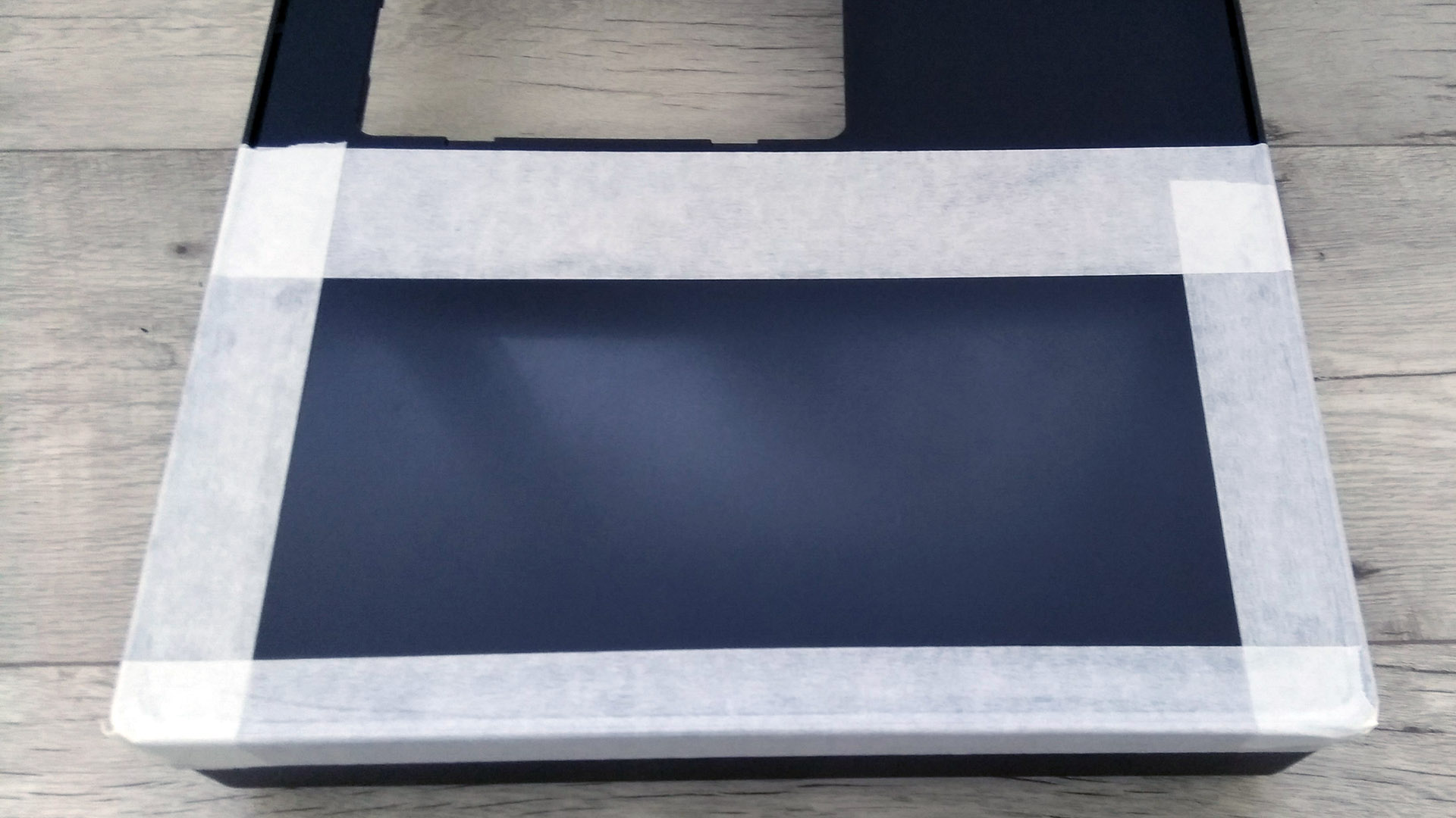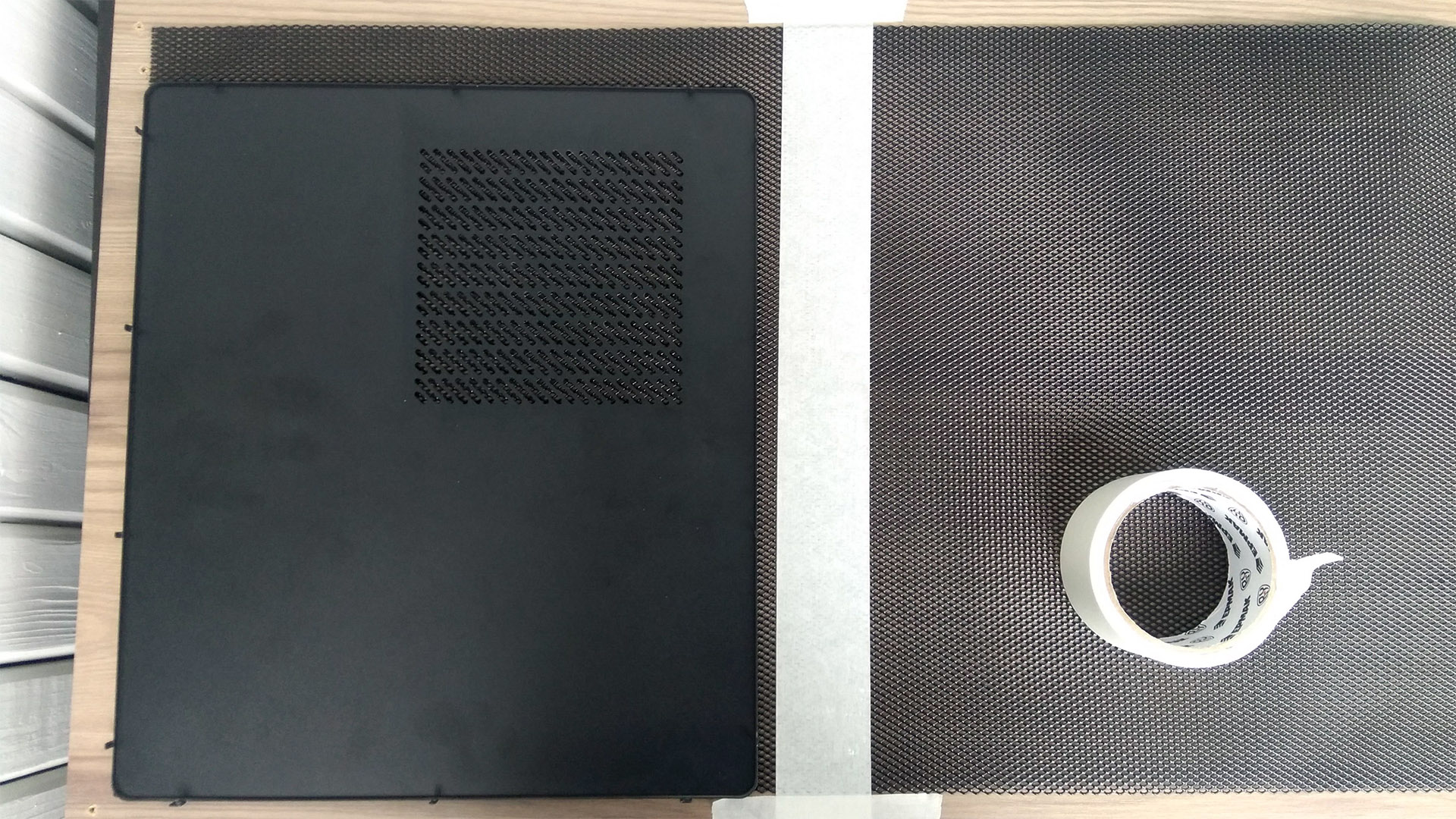 Даже в разобранном виде крышка имеет достаточную жесткость, так что вставка несет скорее декоративную функцию и придает более дорогой вид корпусу. После снятия металлической вставки отмечаю будущее окно и по периметру обклеиваю бумажным скотчем, чтобы удобнее было пилить.