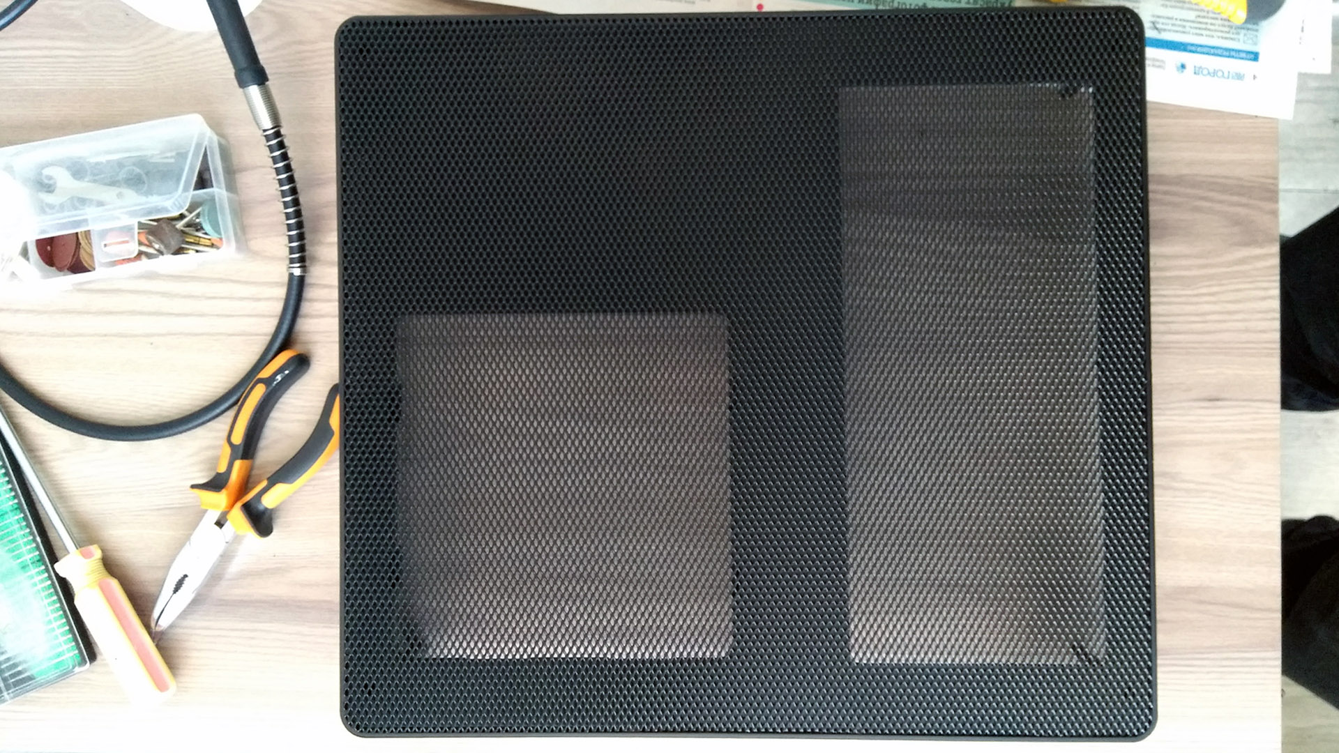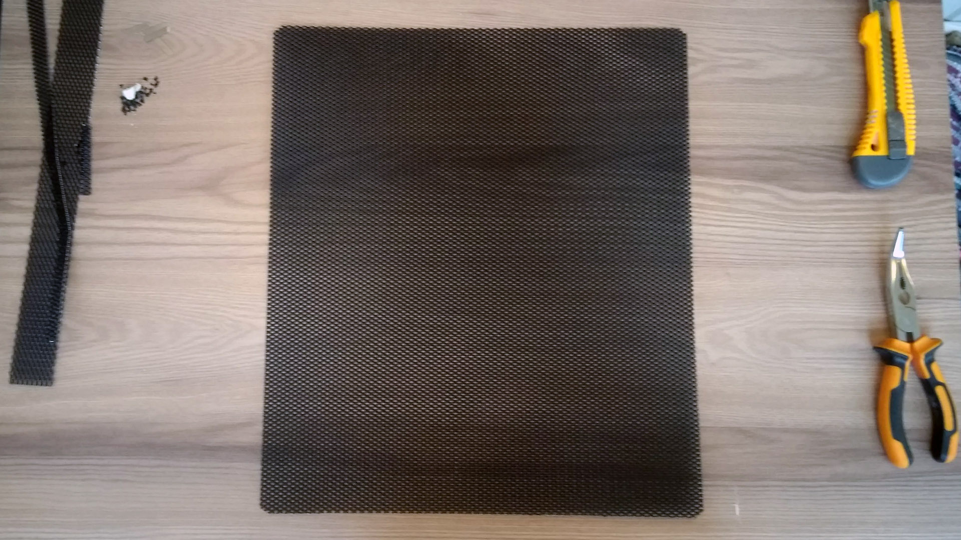 Изначально предполагал насверлить дырок в родной вставке или заказать вставку из оргстекла с нарезанными вентиляционными отверстиями. Затем мне подсказали вариант с автомобильной сеткой для бампера. Стоит недорого, легкая в обработке. Мне вообще досталась бесплатно.