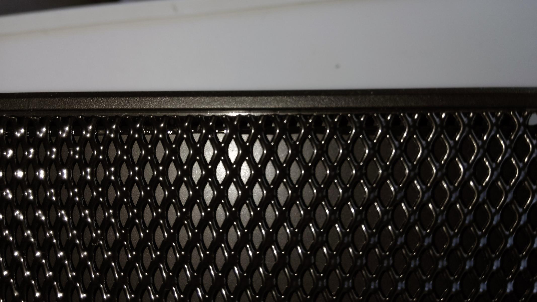 Обрабатываем края все тем же ножом и примеряем сетку к крышке. Родная вставка имела толщину ~0,65мм, сетка по документам- 0,8мм, но встает в крышку так же хорошо. Кромки, где проходился ножом, подкрасил обычным маркером-краской.