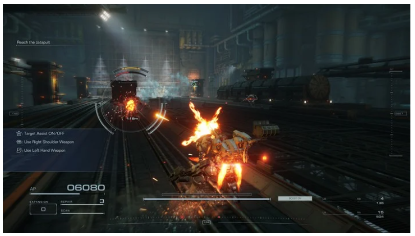 Оружие вашей правой руки - это винтовка с посредственным уроном и силой воздействия, но приличной дальностью и скорострельностью, а также огромным запасом боеприпасов. Она поддерживает автоматический огонь, поэтому вы можете просто удерживать правый спусковой крючок, чтобы продолжать стрельбу. Большинство пилотов меха откажутся от такого оружия, потому что оно не имеет большого урона в секунду, но для некоторых миссий, где вы сражаетесь с множеством мелких врагов, его выносливость действительно может быть полезна. Вы можете вручную перезарядить винтовку после боя, удерживая кнопку Y и нажав RT; кстати, это не влияет на запас патронов.