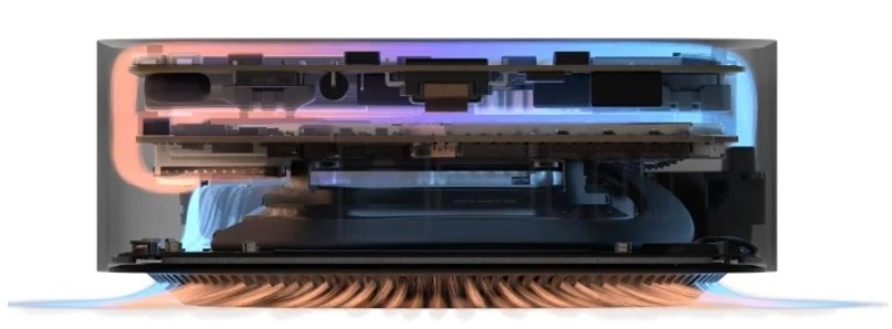 На первый взгляд система охлаждения Mac mini кажется немного переусложненной. Вентилятор втягивает холодный воздух через нижнюю часть передней части системы, циркулирует вверх и через внутренние компоненты, а затем выталкивает горячий воздух вниз и наружу через заднюю часть основания. Предыдущие модели имели задние вентиляционные отверстия для прямого выпуска, а Mac Studio имеет большое перфорированное вентиляционное отверстие. Мы не сомневаемся, что это работает, но нам придется проверить это при первой возможности. По какой-то причине Apple разместила кнопку питания внизу. Так что теперь, чтобы включить Mac mini, вам сначала нужно его наклонить.