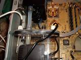 Перекур и снова за работу. Теперь нужно в контур залить воду и проверить на течь. Снимаем процессорный водоблок и... он не снимается. Модифицированный прижим буквально мертвой хваткой уцепился за ушки и никак не хотел отжиматься. Применяя чрезмерную силу можно было сломать материнку, но каким-то образом я отодрал его вместе с одним ушком сокета. Это было как гром среди ясного неба. Но назад уже не вернешь.