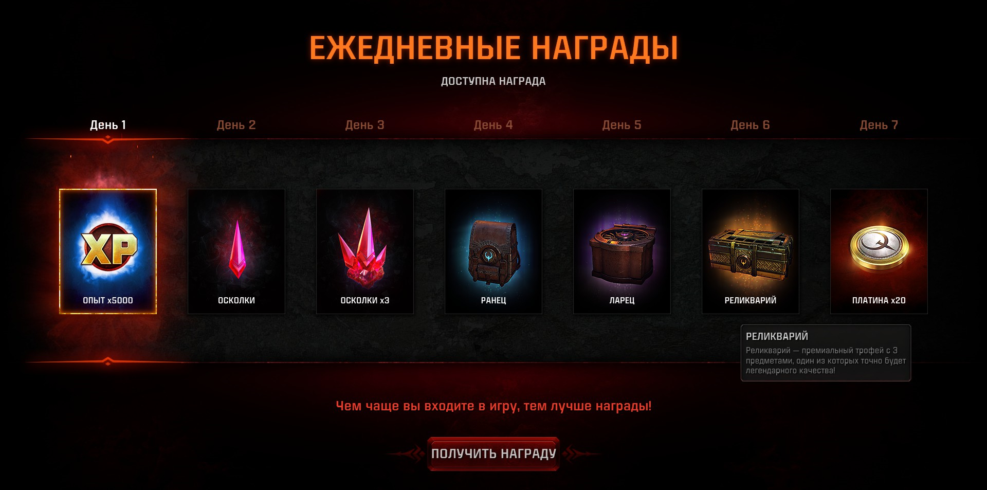 Кроме того, в игре есть награды за вход. Если каждый день входить, вы получаете осколки, опыт, различные по содержанию кейсы с скинами и в конце недели платину. Продать скины нельзя.