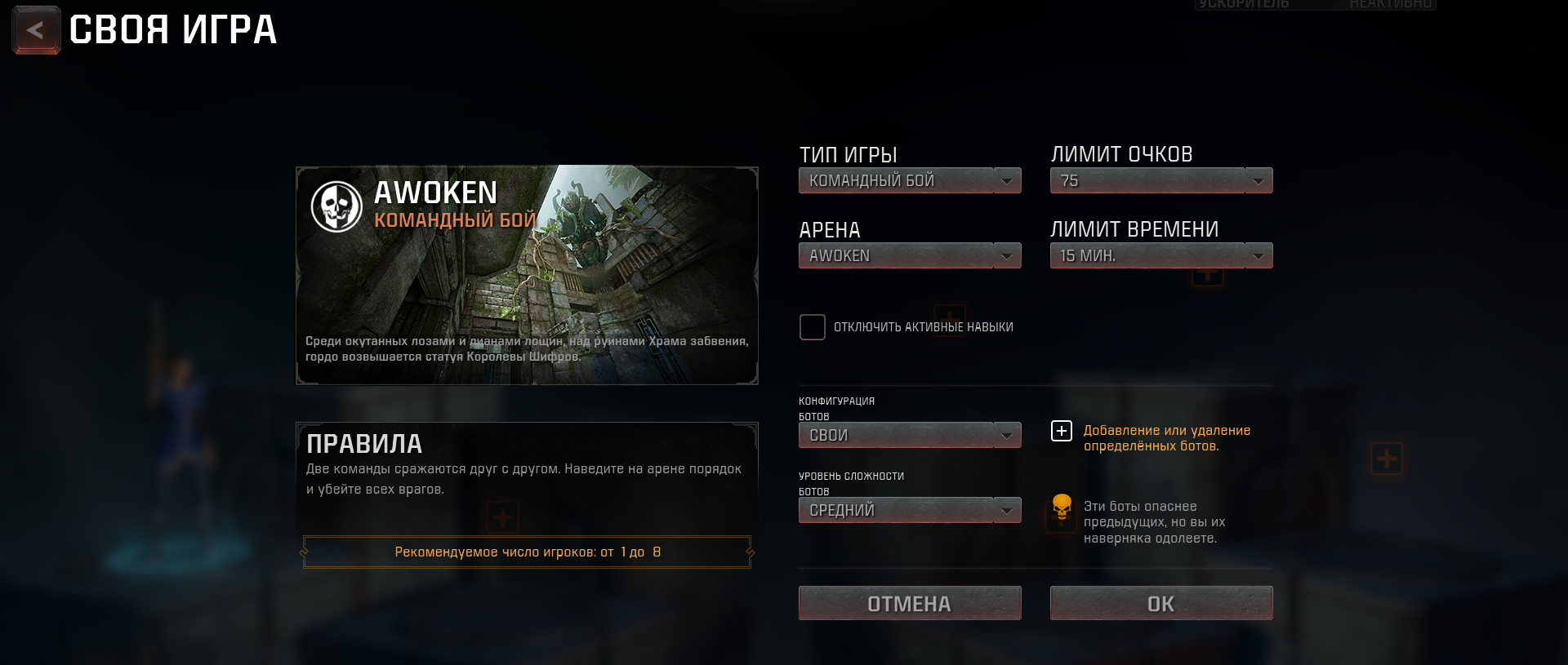 Наконец, самый полезный и разнообразный раздел - “Своя игра”. Это игра с ботами, матч в которой можно настроить под свои потребности. Режимов здесь невероятно много, уровень сложности ИИ и прочие вещи можно настроить.