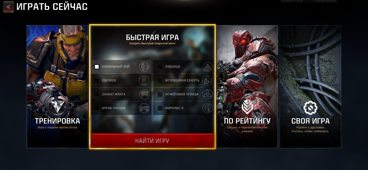 - Если вы хорошо играли в прошлые игры серии Quake или Unreal, вам подойдет режим “Быстрая игра” и “Рейтинговая игра”.