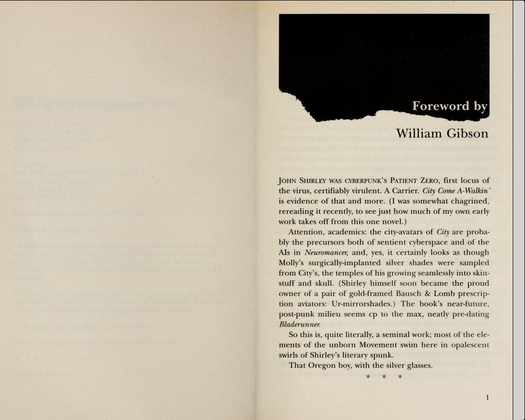 - Роман “И пришел Город” часто сравнивают с “Нейромантом”. Но пока последний старел, “И пришел Город” удивительным образом сохранил свою свежесть и актуальность. Возможно дело в том, что Джон Ширли выбрал тему куда более актуальную для будущих поколений, чем Гибсон. Перед публикацией блога я взял английское издание романа и удивился — в предисловии Гибсон говорит, что многое взял из этого романа и перенес в “Нейромант”. Еще один повод прочитать этот чудесный роман первым.