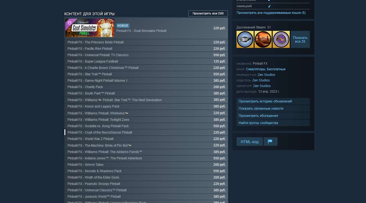 У этого пинбола есть проблемы с запуском, но я советую не обращать на них внимание — игра работает хорошо. Средняя цена на DLC во время распродаж — 128 рублей.