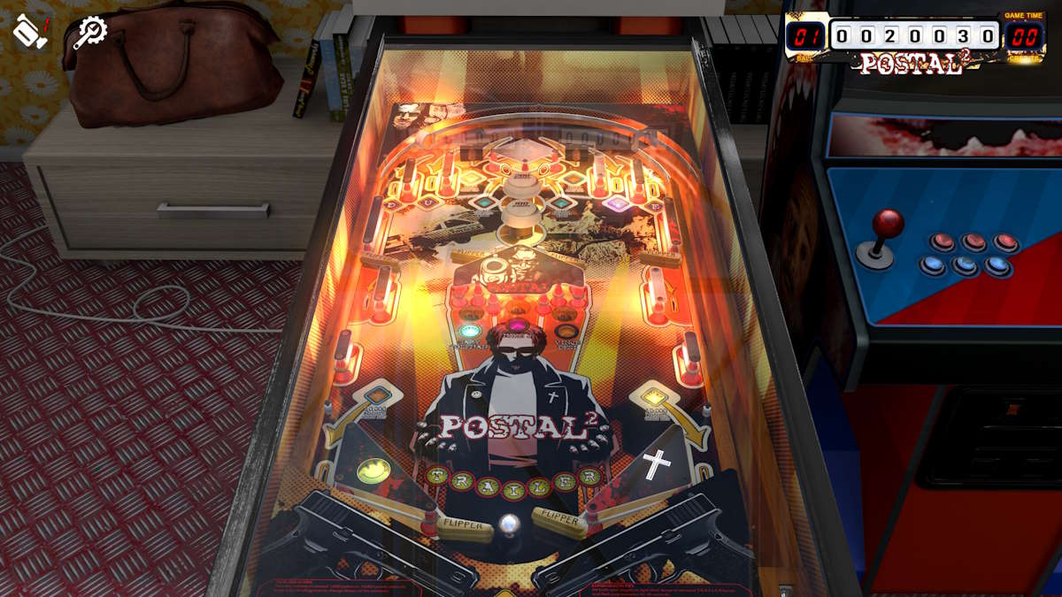 Восемь столов по игре Postal. Всё в них отдает атмосферой старых пинбольных автоматов -— заливающий поле свет, покрытые лаком иллюстрации, фигурка Чувака, что выглядит именно как фигурка. Эти столы очень отличаются от современных, красивых и ярких столов. Они будто созданы где-то в начале 90х и всю жизнь стояли в аризонском баре, но внезапно попали в руки к фанату Postal.