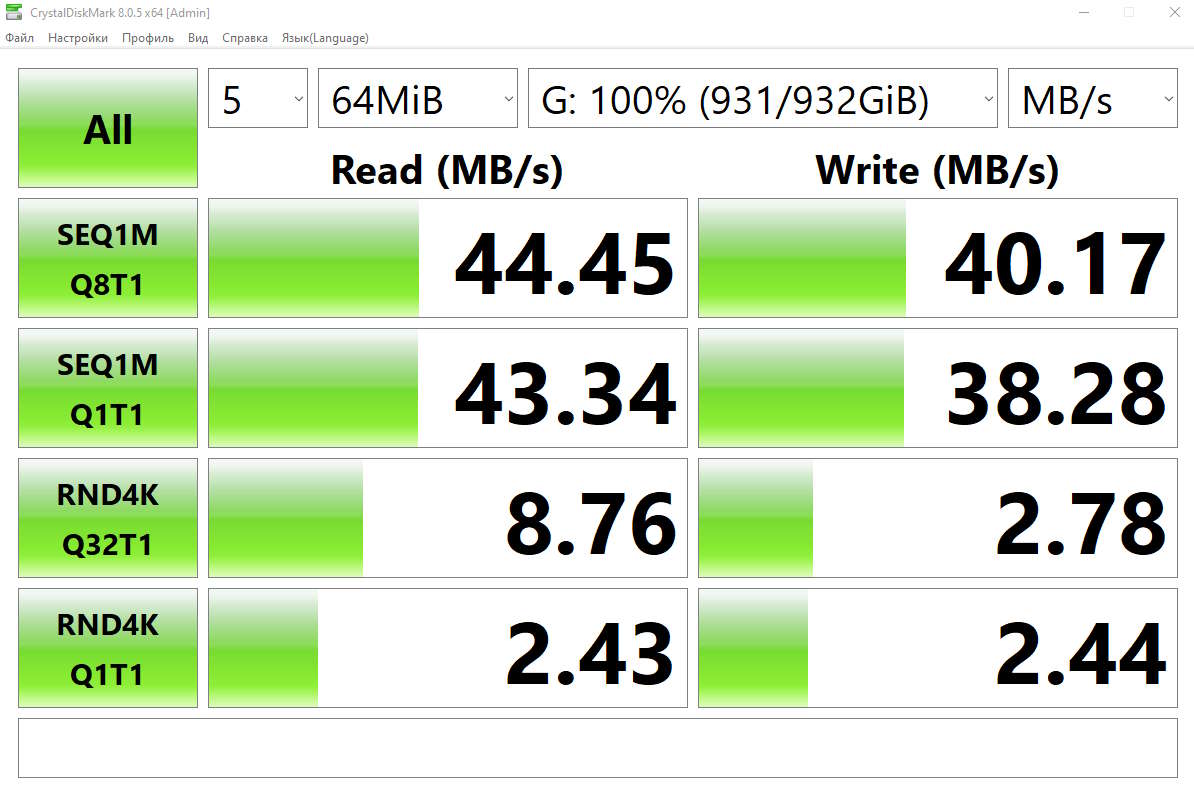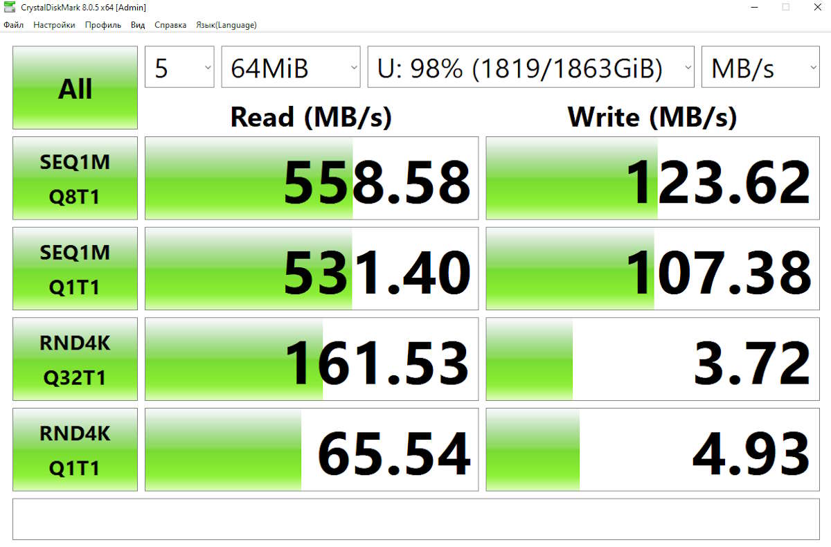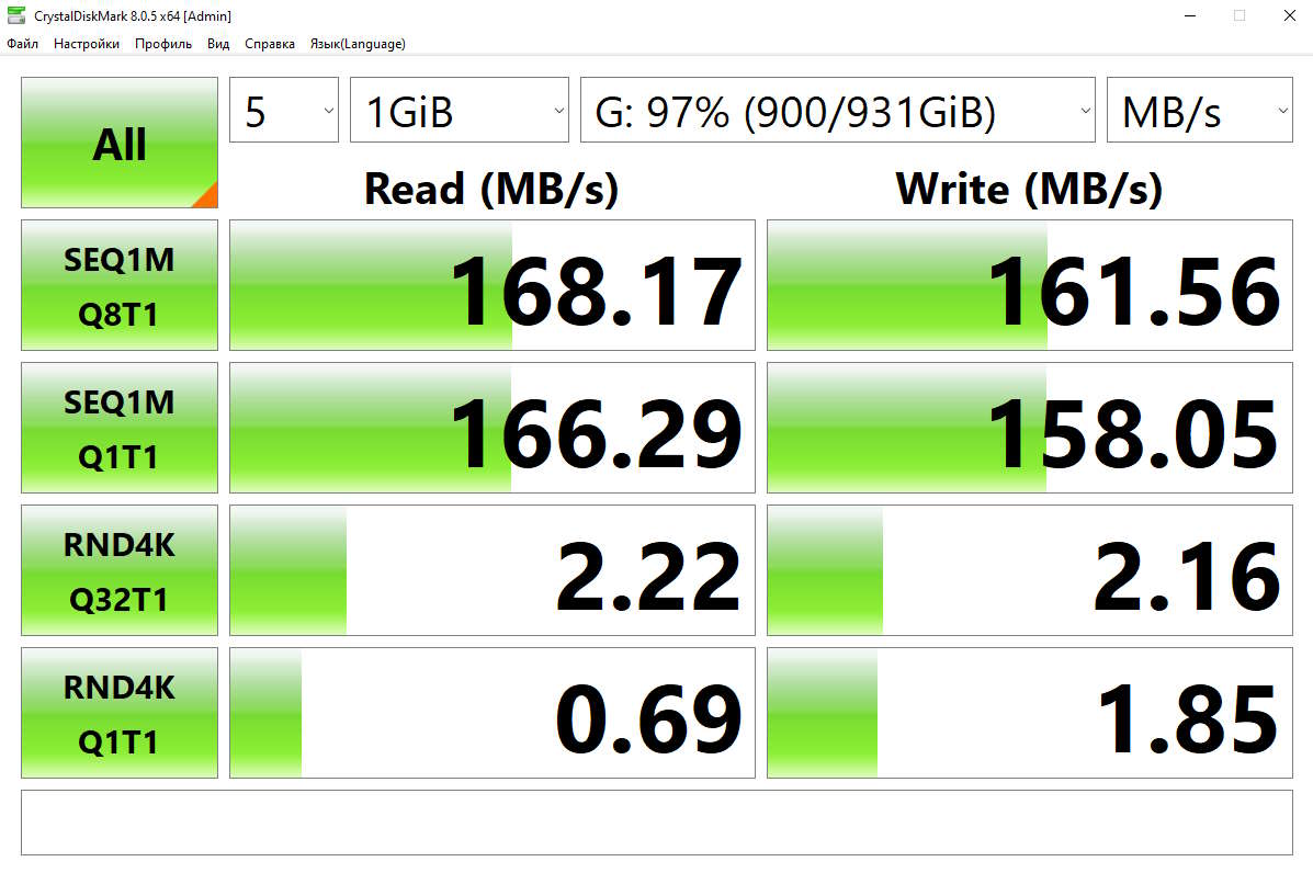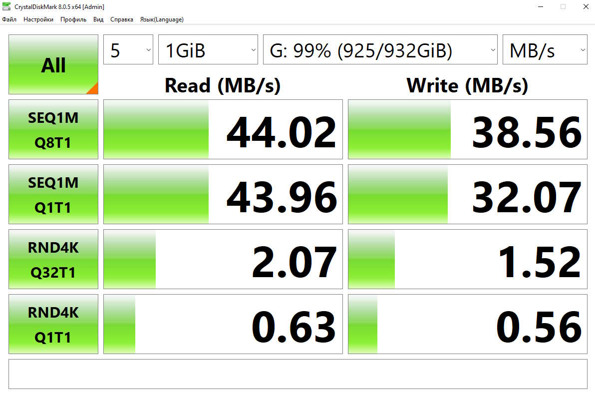 Вот тест скорости диска из моего ПК. Обычно на него пишется видео и сохраняются скриншоты. Разница очевидна.