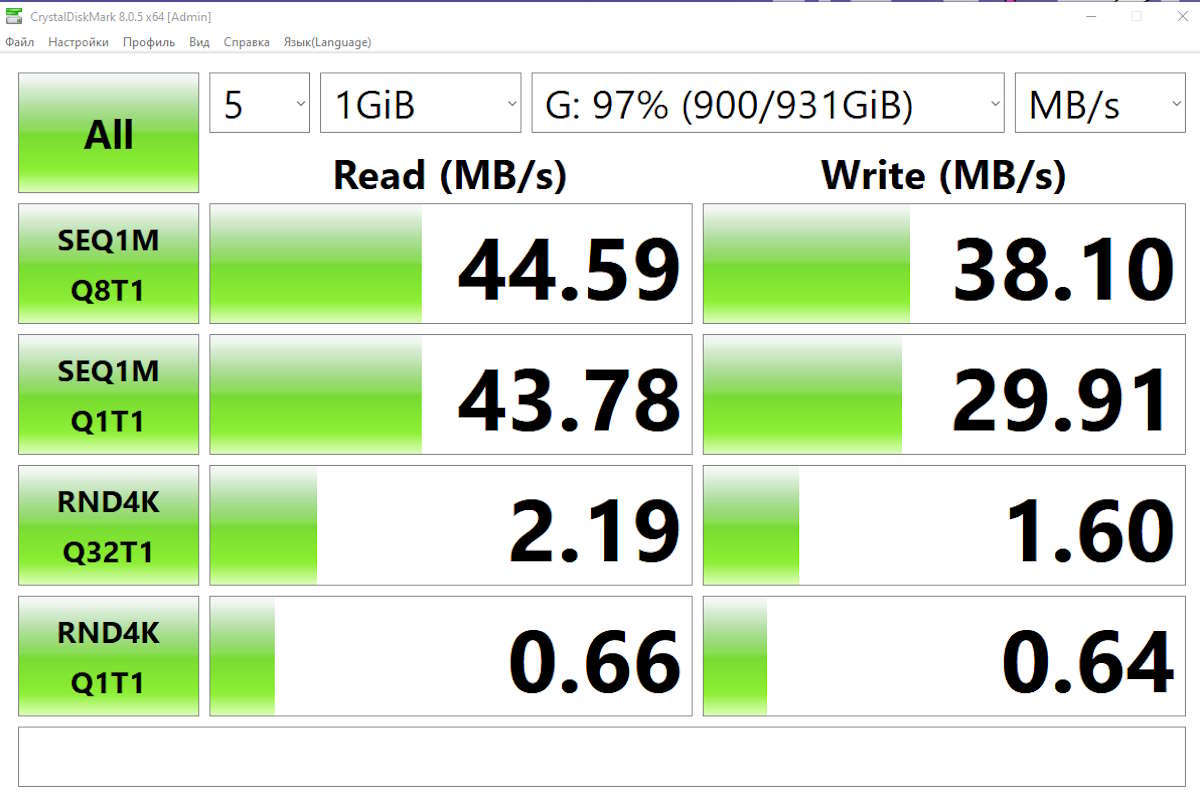 У меня есть несколько дисков, заполненных файлами. Все они на 7200 оборотов в минуту. Тестировал их я программой CrystalDiskMark 8. Первый тест был на скорость записи 1 гб, 1 Tb HDD WD Blue. Срок службы диска - 3 года. Порт USB 2.0.