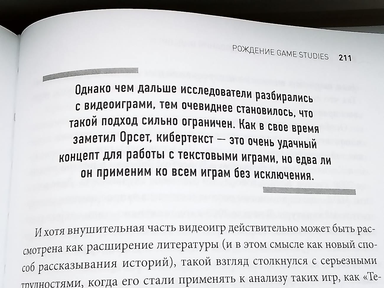 Четвертая часть станет для многих читателей очень сложным испытанием. Она называется “Академические исследования видеоигр”. Тут много сложных терминов, спорных тем и в целом, эта глава отличается от всей книги высоким порогом вхождения. Первая её глава “Рождение Game studies” рассказывает о том, как научные исследования видеоигр. Рассказывается о людях и организациях, повлиявших на появление этой дисциплины. И конфликте, который возник между нарратологами и людологами в процессе поиска подхода к изучению видеоигр. Становится понятно, что пусть к появлению game studies был не простым.