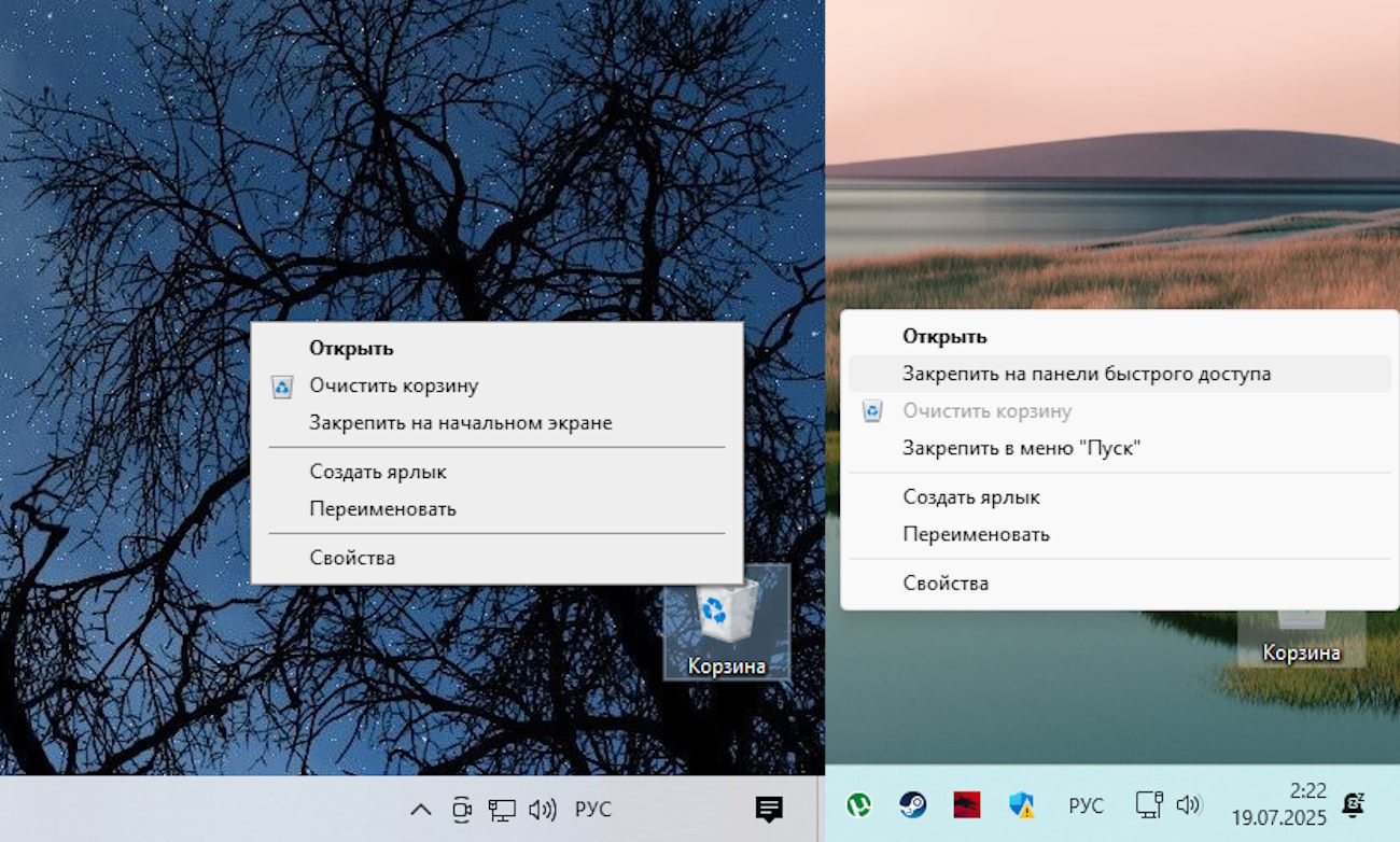 Также меня очень «порадовало» контекстное меню корзины. Потому что вместо привычного пункта «Очистить корзину» я всё время кликаю на «Закрепить корзину». Привычные всем пункты зачем-то поменяли местами.
