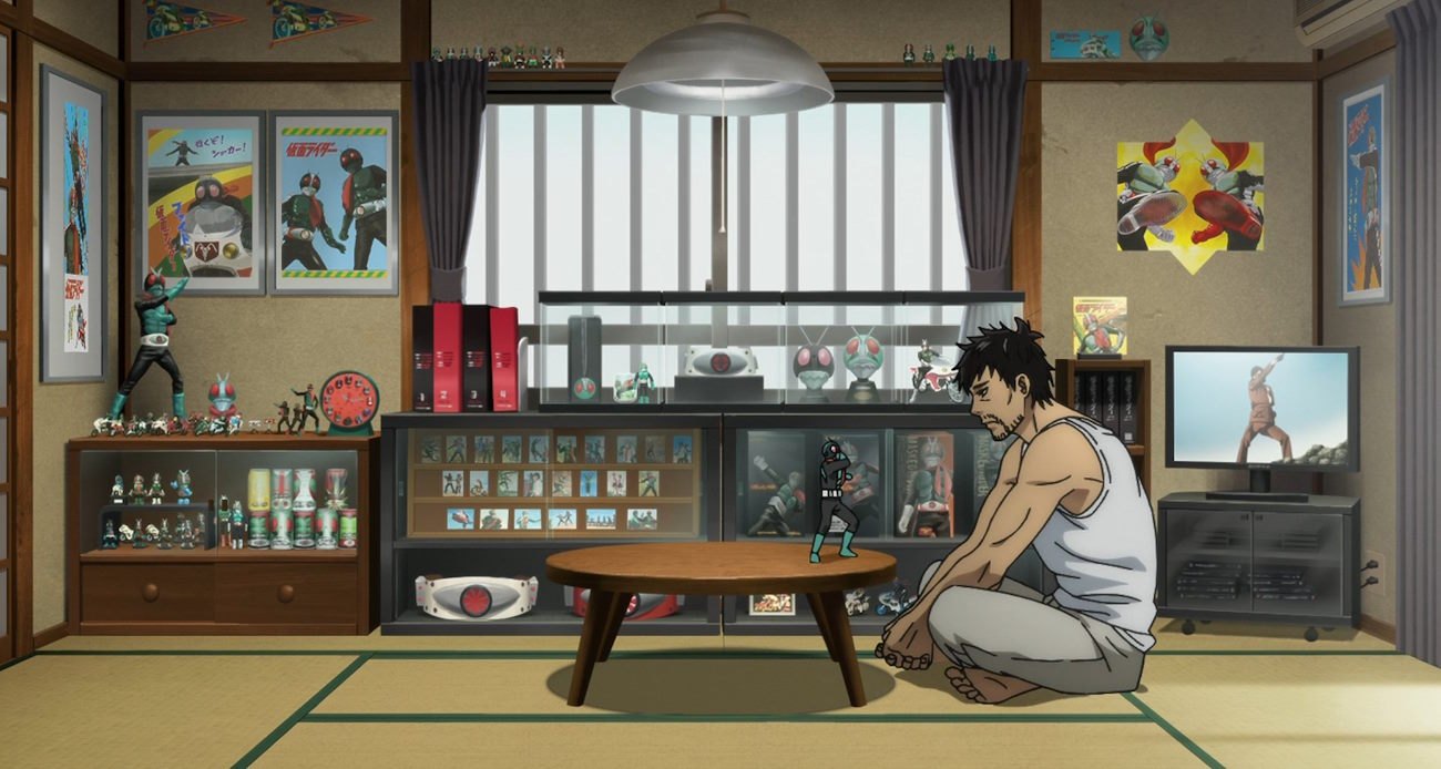 Так о чем это аниме? Простой японец Кендзабуро Тодзима с детства мечтал стать Наездником в маске. Он тренировался, покупал мерч, пересматривал всё, что было связано с Kamen Rider. К 40-ка годам он полностью разочаровался в своем герое. Продал мерч и стал жить обычной жизнью. Без героизма и приключений. Одинокий и несчастный.