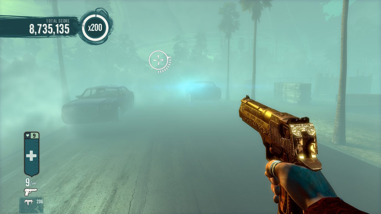 Особенно в этом плане выделяется уровень кладбище. Этот уровень очень грамотен с точки зрения нарративного дизайна – он ссылается на предыдущие события, раскрывает сложные отношения Тони с отцом, показывает целеустремленность Тони, а заодно постоянно меняет настроение. На кладбище стоит сильный туман. Его атмосферу не спутать ни с чем. Дымка, пальмы, лазерные прицелы врагов...
