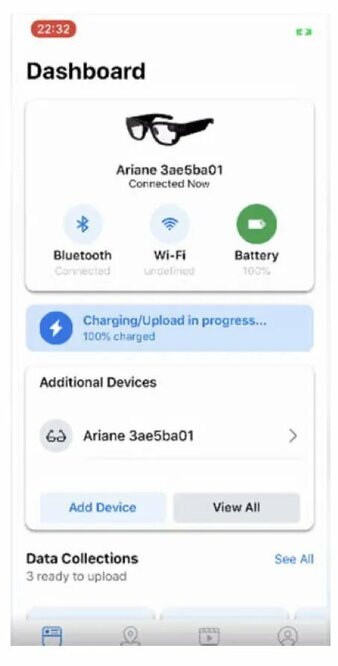 Итак, какую же информацию об очках Project Aria можно найти в руководстве? Судя по внешним характеристикам, особая разница между устройством и обычными очками отсутствует. Однако первое впечатление, как говорится, часто является обманчивым. В Project Aria установлены сразу четыре камеры, точно такие же установлены в Oculus Quest 2. С помощью этих камер можно создавать трёхмерные карты окружающего пространства, также доступно отслеживание собственного пространства относительно других объектов, причём с довольно высокой точностью. Что касается зарядки устройства, то она осуществляется посредством магнитного коннектора. Очки передают собранные данные в специальное приложение, в котором также можно отслеживать уровень заряда устройства и состояние подключения.