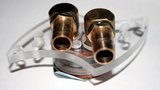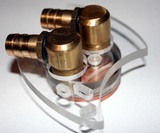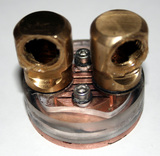 Само основание медное (марки М1), высотой 3мм, в центре фрезеровкой сделаны ребра к количестве шести штук. Водоблок гарантировано, надежен от протечек, т.к. схема просто и очень качественно реализована. Штуцеры разборные, латунные, везде применены резиновые прокладки, и резьба обработана герметизирующим составом. Диаметр штуцера «елочки» 12мм с наружи и 9мм внутри, на практике, шланг с внутренним сечением в 12мм пришлось закрепить, уж больно мне показалось не надежно соединение, но шланг в 10мм уже очень сложно натянуть.