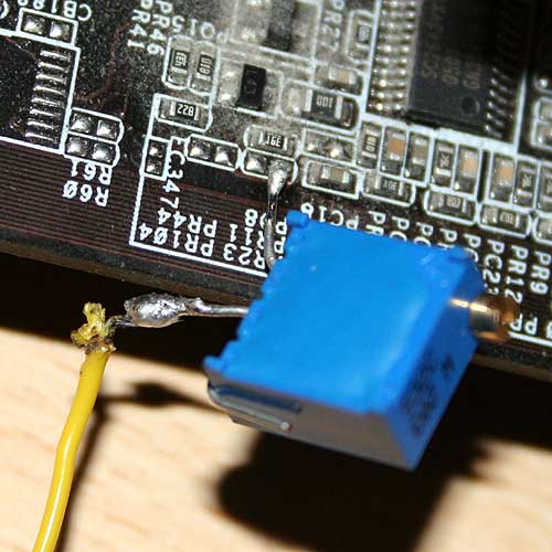 Тут нас ASUS не обидел, есть два удобных способа «вылечить» материнскую плату. Начнем с более сложного, но гибкого и эффективного вольтмода с применением резистора. Для всей модификации нам понадобится паяльное оборудование (паяльник, припой), подстроечный резистор на 10кОм, провода и каплю терпение.