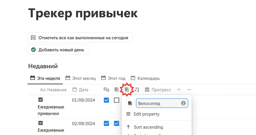 Сейчас пока покажу, как добавить новую привычку. Нажимаем на любую из оставшихся, после чего выбираем Duplicate property. Получится копия, но ее сразу же можно переименовать в то, что нам надо. Например, я хочу вместо тренировок сделать поездки на велосипеде — скопировал «Чтение», но вместо второго «Чтения» соответственно будет «Велосипед». Иконку тут же меняем, чтобы не путать книгу с велосипедом.