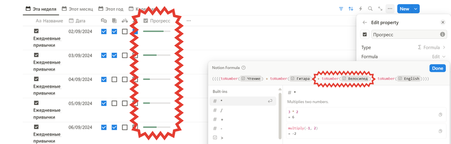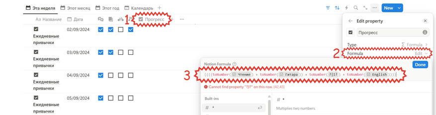 Нажимаем на «Прогресс». Затем «Edit property» — «Formula».