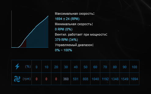 В результате тестирования вентиляторов были получены следующие значения для диапазона регулировок: