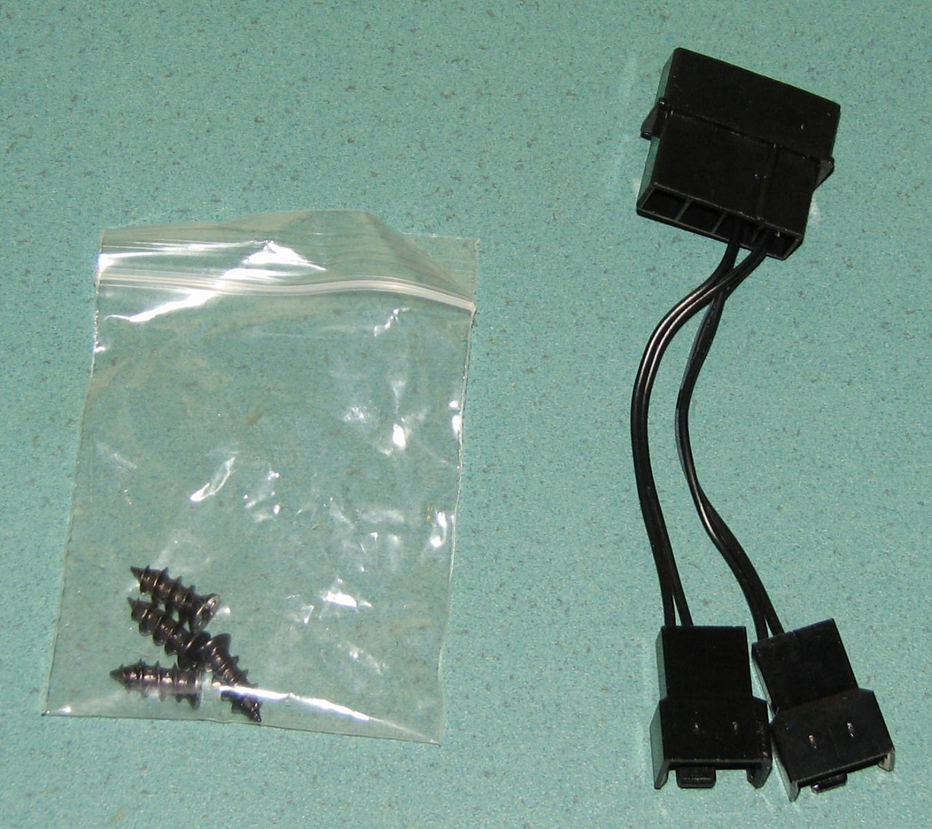 Сверху в коробке организован отсек, в котором лежит крепёж и переходник-разветвитель с молекса на пару 3пин разъёмов.Толи у вентилятора отверстия под крепления шире чем надо, то-ли саморезы тонковаты, но их легко прокрутить, так что если вы будете использовать только их, то крутите осторожнее.