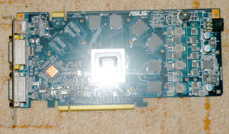 В силу кривых рук и не слишком великого опыта общения с цифровиком, снять нормально чипы памяти и ГПУ, чтобы можно было прочитать маркировку – не смог. Тем не менее сочетание символов 0807A2 говорит о том, что перед нами g92-a2-192bit выпущенный на 7й неделе 2008 года. Память – hynix с временем доступа 1.1нс.