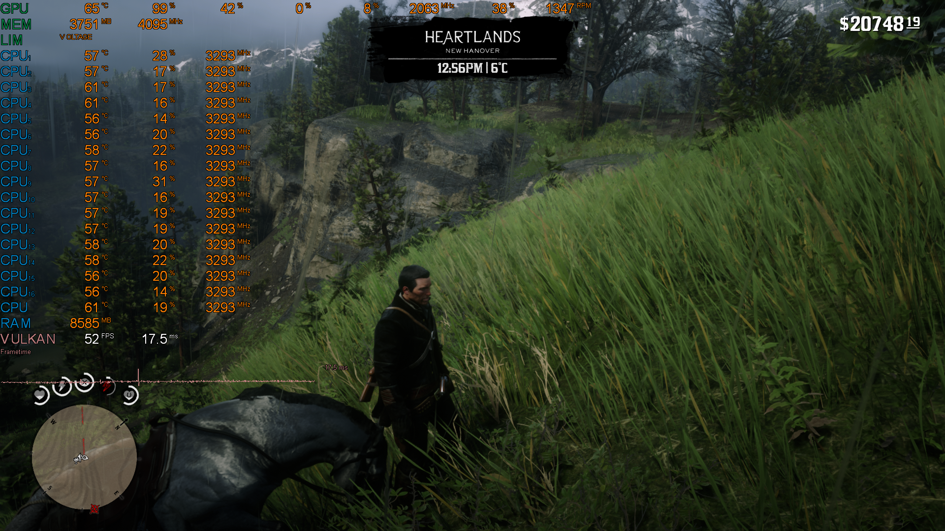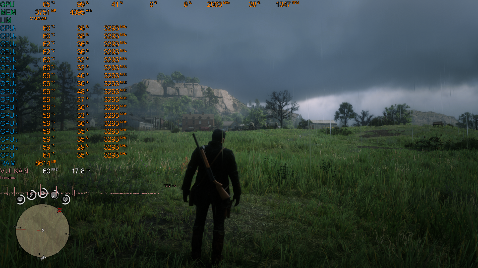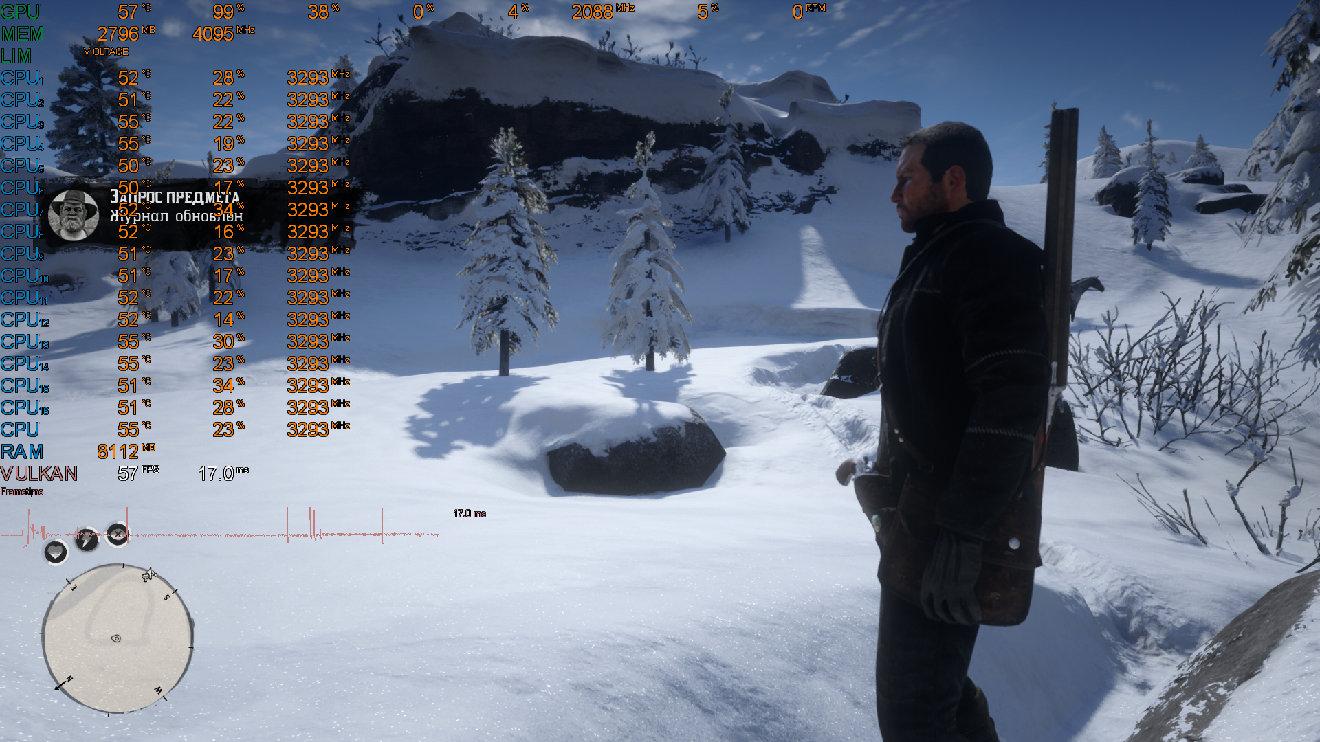 На следующих изображениях есть показатели загрузки системы и количество кадров, что не опускается ниже 50 FPS. Картинка очень приятная глазу, нет "лесенок" и микрофризов.