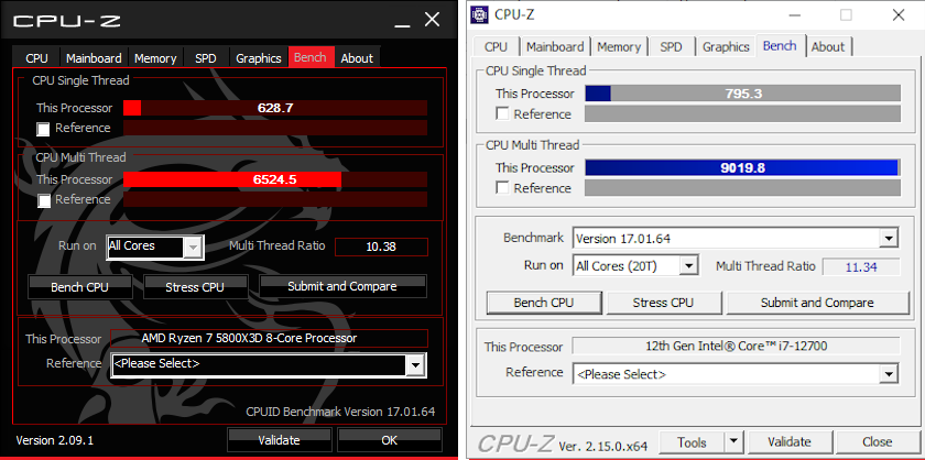 Тест CPU-Z показывает значительное превосходство i7-12700 над 5800X3D: