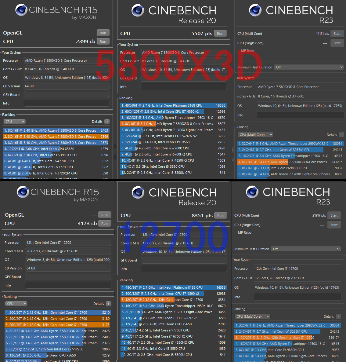 А по итогу AMD Ryzen 5800X3D оказывается безоговорочным лидером в данном бенчмарке, опережая i7-12700 в режиме с 20 потоками по умолчанию на внушительные 31%,но если на i7-12700 оставить только 8P ядер без потоков, то разница сокращается до 10%!