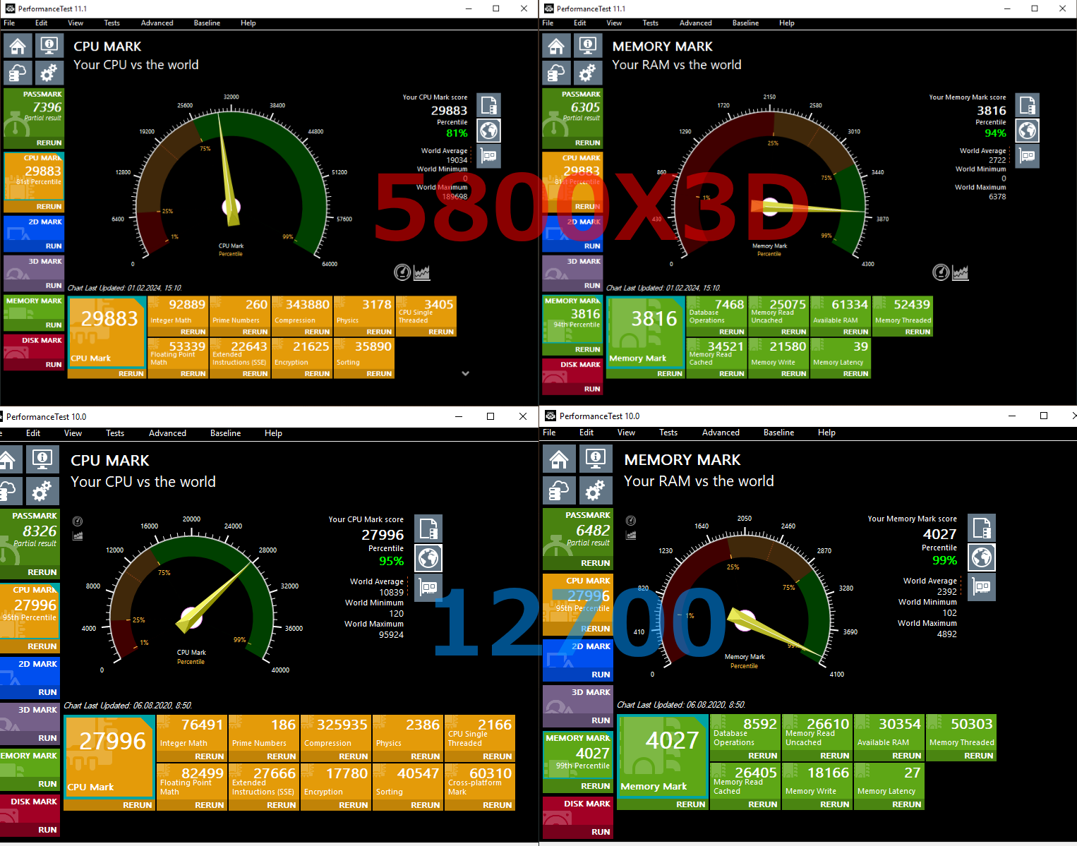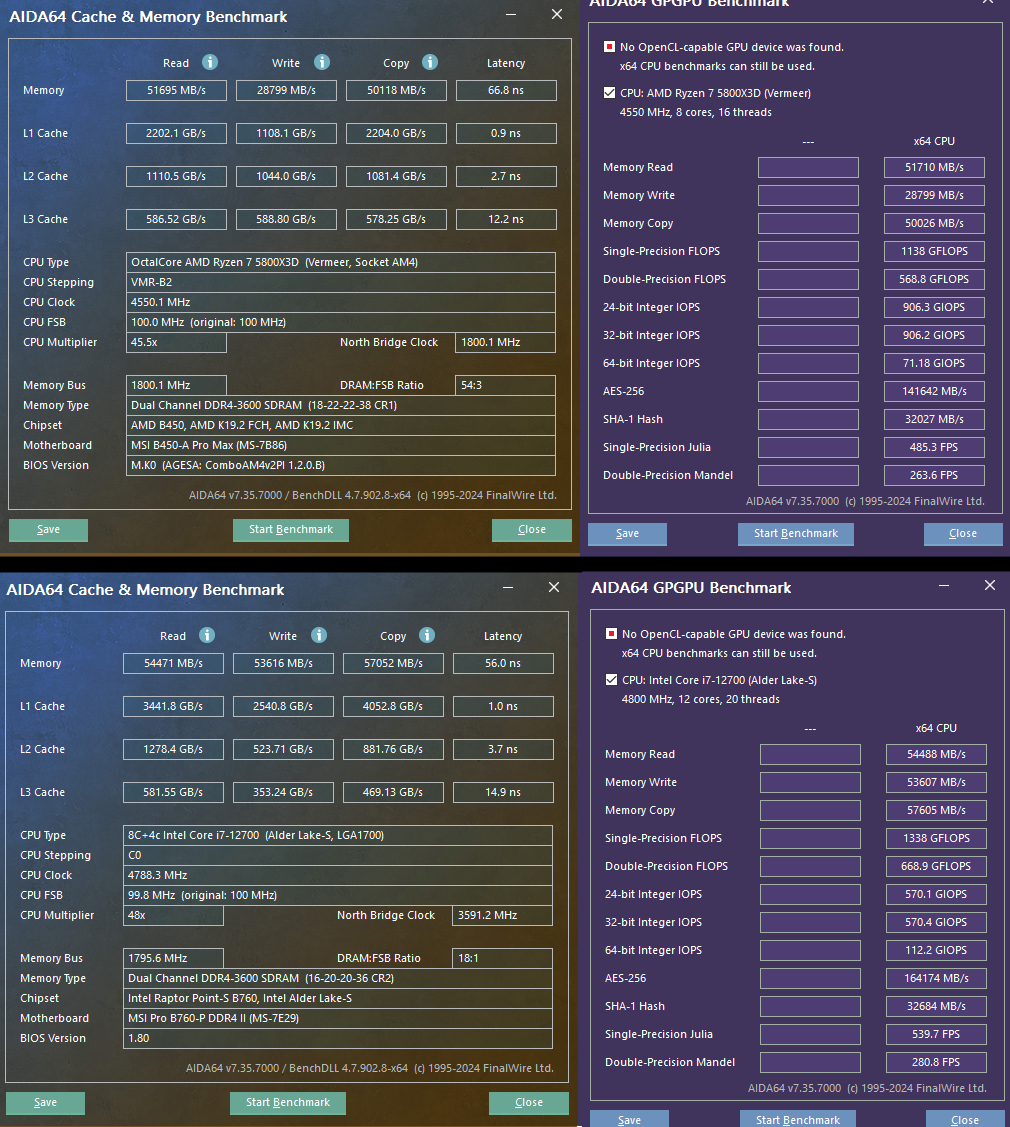 В PassMark процессор AMD Ryzen 7 5800X3D показывает уверенную победу в тесте CPU, опережая Intel Core i7-12700 по общей вычислительной производительности. Однако в тесте памяти ситуация кардинально меняется Intel ожидаемо вырывается вперёд благодаря более высокой пропускной способности и лучшим задержкам. Стоит отметить, что сам тест PassMark уже заметно устарел и, судя по всему, не совсем корректно определяет гибридную архитектуру Core i7-12700, задействуя не все потоки. Тем не менее для полноты картины решил оставить этот тест в итогах.