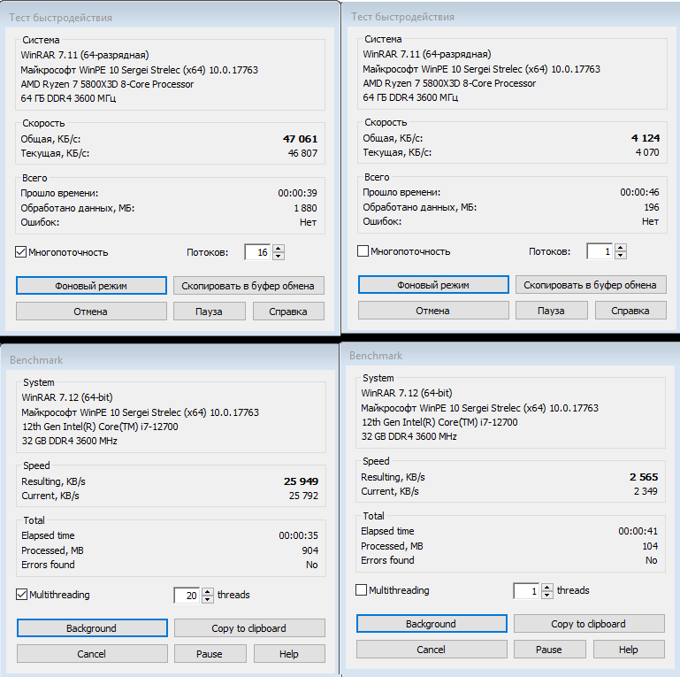 В тесте WinRAR наблюдается сокрушительное преимущество AMD над Intel. Разница в скорости архивации достигает почти двухкратного превосходства в пользу Ryzen 5800X3D. Такая картина вполне ожидаема, поскольку задачи, связанные с архивированием данных, традиционно являются сильной стороной платформ AMD благодаря более эффективной работе с кешем и внутренней архитектуре процессоров Zen.