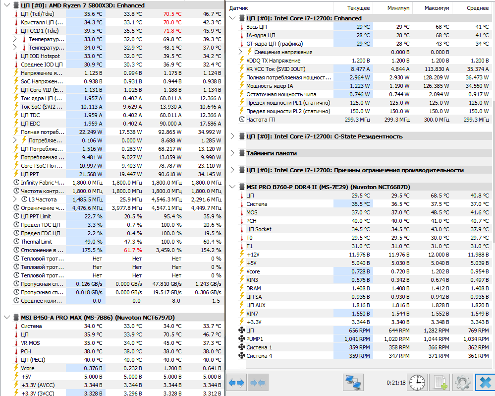 Особо стоит выделить температурный режим процессора Intel Core i7-12700. Даже в условиях июльской жары и отсутствии кондиционера температура процессора не превышала 68 градусов. Для сравнения, тесты на платформе AMD проводились в начале мая в более прохладной комнате, однако температура процессора там стабильно превышала 70 градусов.