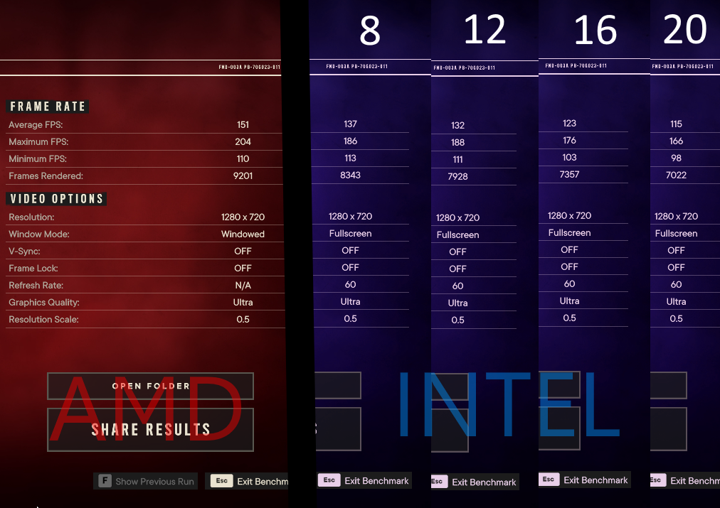 Если смотреть на результаты в двух стабильных режимах с 8 потоками (только P-ядра без HT) и с 16 потоками (P-ядра с включённым Hyper-Threading), то картина вполне очевидна. Режим с 16 потоками уверенно лидирует, потому что игра хорошо заточена под много-поточность. Однако даже так i7-12700 чуть не дотягивается до показателей Ryzen 5800X3D, уступая как по среднему fps, так и по минимальным значениям.