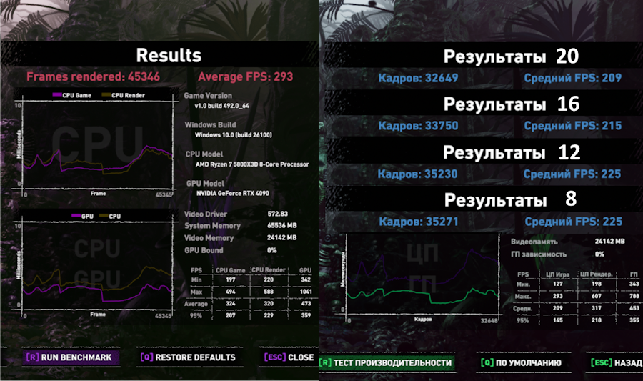 При максимальных настройках графики с RT на максимуме и максимальным Object Range на 10 Ryzen 5800X3D не справляется с удержанием стабильных 60 fps в наиболее тяжёлых графических сценах города. В некоторых локациях наблюдаются заметные просадки ниже комфортного уровня.