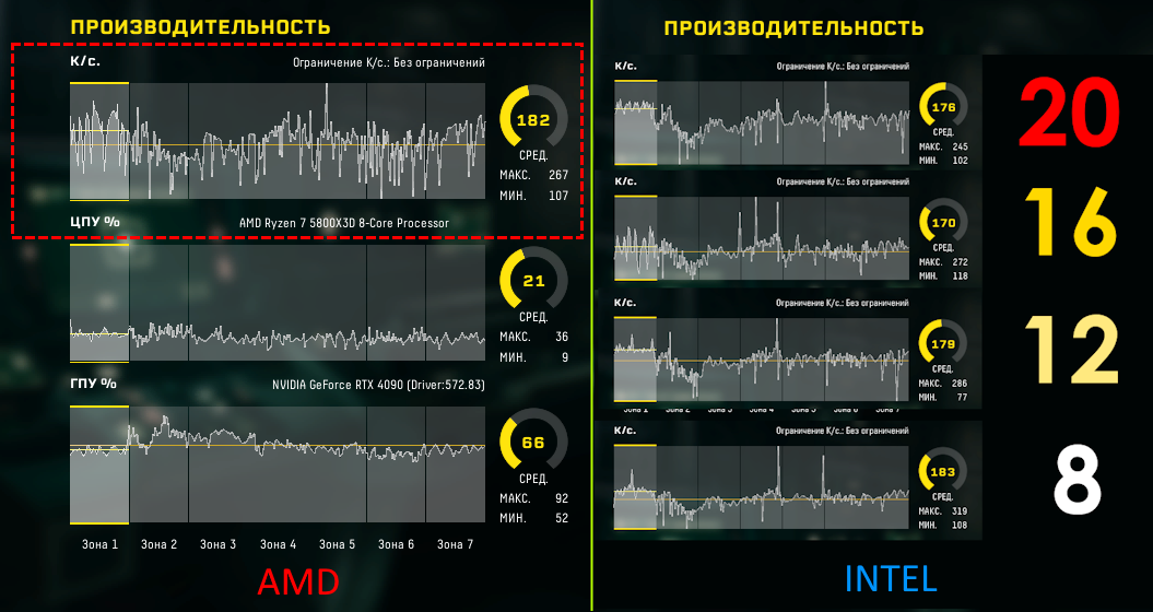 В данной игре ситуация складывается иначе: AMD Ryzen 7 5800X3D удерживает лидерство по средней частоте кадров над полной 20-поточной конфигурацией Intel Core i7-12700. Однако стоит отметить, что режим с 12 потоками на Intel (8P + 4E) показывает практически равный средний fps с AMD. Во всех режимах тестирования у Intel стабильно выше минимальные значения fps по сравнению с AMD, особенно заметно преимущество по минимальному fps в режиме 16 потоков (8P + HT, без малых ядер).