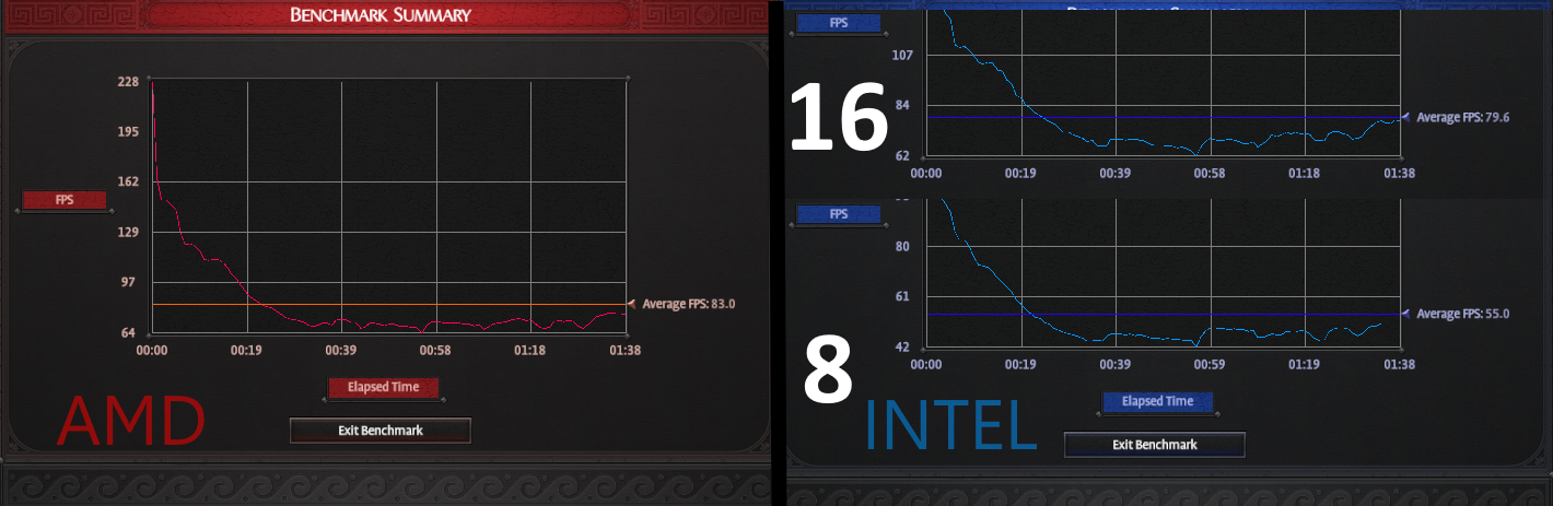 Преимущество AMD Ryzen 7 5800X3D оказывается просто сокрушительным. Разрыв по средней частоте кадров достигает полутора раз в сравнении с Intel Core i7-12700 в стандартном 20-поточном режиме. Даже наиболее удачная для этого теста конфигурация Intel с 8 потоками (только P-cores без Hyper-Threading и E-cores), которая в других играх иногда сокращала отставание, здесь уже не спасает ситуацию. Данный тест максимально раскрывает преимущество большого кэша L3 у 5800X3D. Честно скажу, видя такой отрицательный прирост после апгрейда, не смог избежать лёгкого разочарования от перехода на Intel.