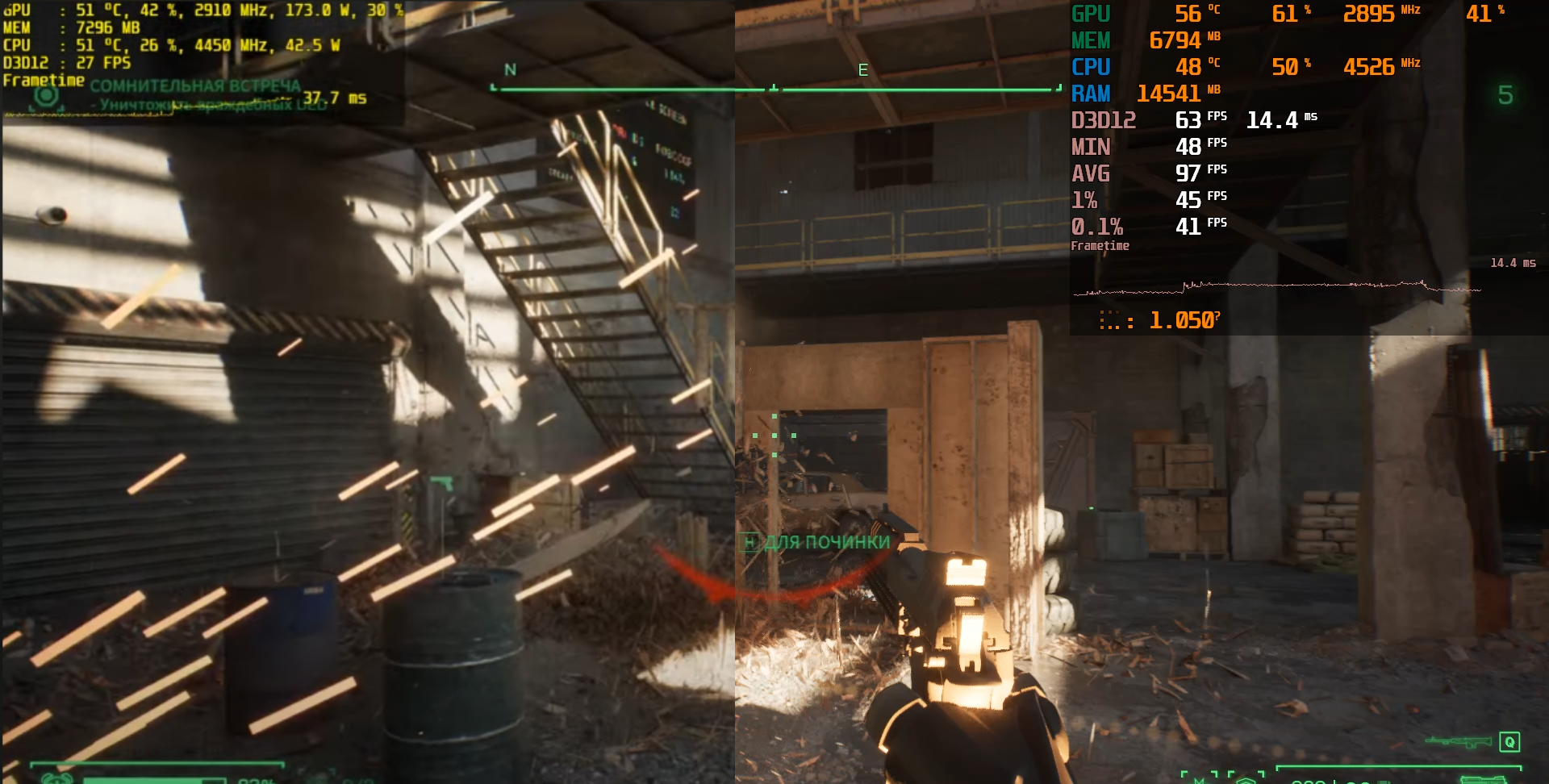 В Robocop: Rogue City личные впечатления от перехода на Intel также оказались неоднозначными. На Ryzen 5800X3D я отыграл более двух часов с полностью стабильными 60 fps под вертикальную синхронизацию, и всё было отлично, до определённого момента. В одной из миссий, на определённой сцене, fps начал проваливаться ниже 30 кадров в секунду, а среднее значение уверенно опустилось ниже 60 fps. Я специально сохранил сейв с контрольной точкой в этой проблемной зоне и впоследствии использовал его для теста на Core i7-12700. На Intel та же сцена также вызывала просадки ниже 60 кадров, однако минимальные значения не падали ниже 40 fps и падения были столь кратковременны что их было порой трудно уловить, а средний fps оставался выше 60.