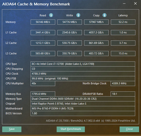 После перехода на платформу Intel я установил те же самые четыре модуля памяти на новый комплект с процессором Intel Core i7-12700. Планки спокойно завелись на XMP, но результат по задержкам неприятно удивил: латентность выросла до 85-90 наносекунд. Сначала я не понял в чем причина, но позже стало ясно, что всё упирается в режим работы памяти. С четырьмя модулями контроллер автоматически переходил в Gear 2, а более оптимальный режим Gear 1 не заводился даже при снижении частоты до 3200 МГц.
