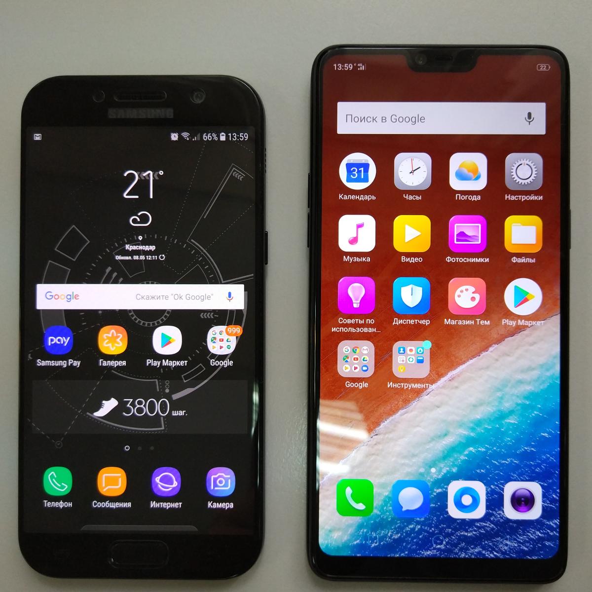 Следующий на очереди Samsung Galaxy A5 (2017) с показателями 146,1 x 71,4 x 7,9 мм и экраном 5,2”. Выводы будут сделаны позже, т.к. ниже будет приведён ещё один подобный аппарат. Конечно, с одной стороны, было бы корректнее привести сравнение с более новой моделью — Samsung Galaxy A8+ с габаритами 159,90 x 75,7 x 8,30 мм. Но, с другой стороны, экран там «всего» 6,0”, а цена почти в полтора раза выше, чем на OPPO F7. Да и по габаритам и весу A8 откровенно проигрывает, такой 191-граммовый «длинномер» не в каждом кармане будет смотреться элегантно.