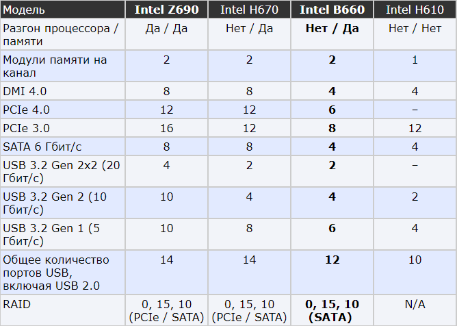 По сравнению с флагманским чипсетом, Intel B660 лишился возможности разгона процессора и получил лишь четыре линии DMI 4.0 вместо восьми.