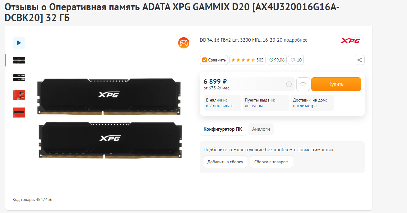 В качестве оперативной памяти - один из лидеров на рынке ADATA XPG GAMMIX D20 с их прекрасными таймингами на частоте 3200 МГц