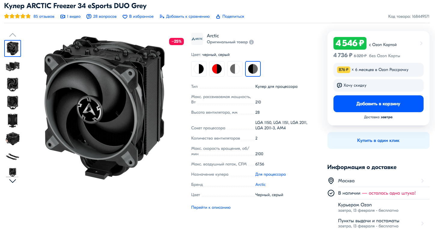 Лучший и недорогой кулер для процессора в 2022-2023 году – башенный ARCTIC Freezer 34 eSports DUO. Ключевая особенность продукта – сниженный до 1.7 мм шаг между пластинами для лучшего рассеивания тепла и 2 120-мм вентилятора с повышенными оборотами (2100 в минуту). Таким образом, при наличии четырех тепловых трубок достигается рассеиваемая мощность в 210 Вт. Но есть пара нюансов. Список поддерживаемых сокетов от Intel: 1150, 1155/1156, 2011/2011 v3, 2066, 1151/1151 v2, 1200. У AMD это AM4, старшие сокеты не поддерживаются. Продукт ориентирован на новые процессоры. Комплект поставки включает крепежные элементы и термопасту MX-4. Пользователи отмечают низкий уровень шума на максимальных оборотах и неприхотливость воздушного кулера в обслуживании.