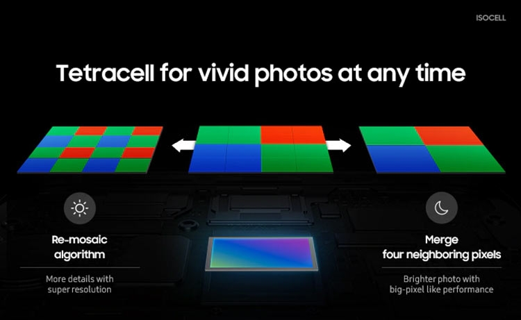 Новый датчик позволяет делать снимки с максимальным разрешением 12 032 х 9024 пикселя (пропорции 4 к 3). За счёт вычислительной фотографии в плане качестве они ещё больше приблизятся к системным камерам. Матрица сделана по технологии Quad Bayer, которая встречается в сенсорах на 48 Мп, 32 Мп, 64 Мп и даже в некоторых датчиках на 20 Мп. Технологию Samsung назвала Tetracell. На практике разрешение составит 27 Мп (6016 х 4512 точек), а размер пикселя – 1.6 мкм. Также технология Tetracell даёт возможность сильно расширить динамический диапазон. Видео можно записывать с максимальным разрешением 6016 х 3384 точки (6K) с частотой кадров 30 к/сек.