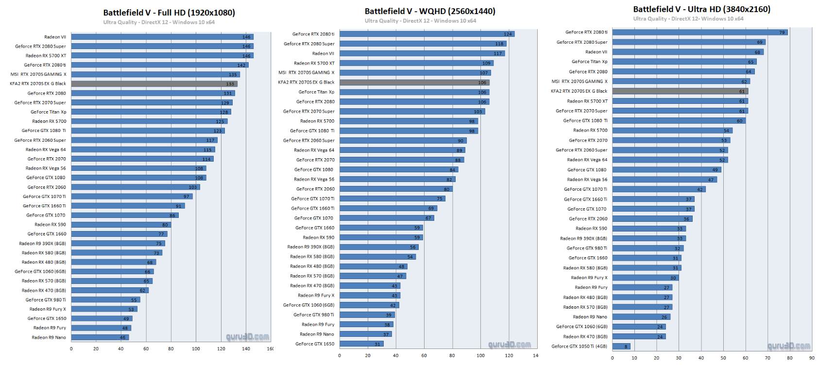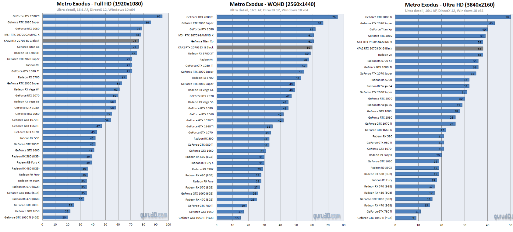 По результатам тестирования, KFA2 GeForce RTX 2070 Super EX Gamer Black обеспечивает стабильные 60 кадр/сек в 4К-разрешении, показывая сопоставимую производительность c RX 5700 XT, которая тестировалась ранее. В игре Metro: EXODUS RTX 2070 Super обеспечивает приемлемую производительность только в 2К-разрешении, выдавая в нем 60 кадр/сек, а в 4К-разрешении частота кадров падает до 38 кадр/сек.