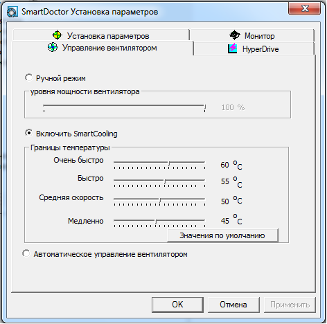 На выбор предлагается фиксированный обороты, режим SmartCooling и авторегулировка. В режиме SmartCooling со значениями по умолчанию получились следующие результаты.