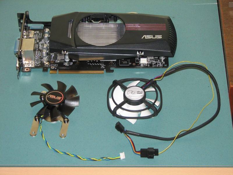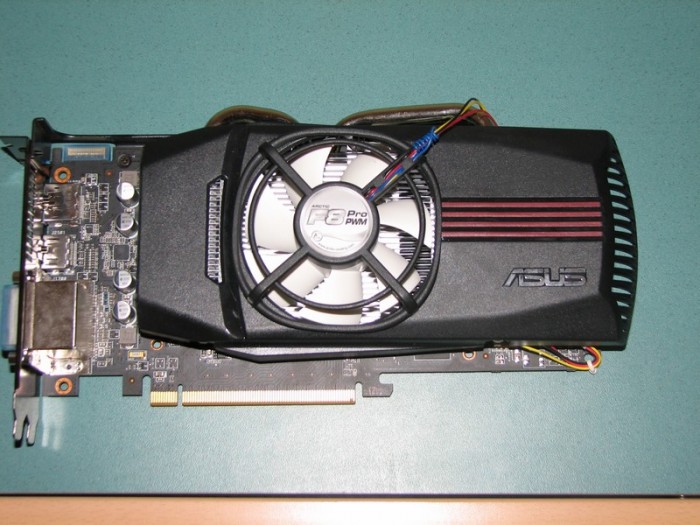 После установки видеокарты в свой компьютер, я естественно начал выяснять насколько оправдались мои ожидания. Надо заметить что системный блок у меня очень тихий. Жёсткий диск и все вентиляторы стоят на амортизаторах. Самый «скоростной» вентилятор работает на 820 оборотах в минуту — это выдувной из корпуса, на задней стенке. Так что любой посторонний звук я слышу очень хорошо. В целом всё было неплохо. Система охлаждения на ASUS EAH 6850 DirectCU действительно оказалась весьма эффективной и очень тихой в простое. Но увы, только тихой а не бесшумной. В тихой системе отчетливо был слышен треск мотора вентилятора. Под нагрузкой, когда скорость вращения вентилятора превышала 2000 оборотов в минуту, ни о какой тишине естественно и речи быть не могло. Вентилятор начинал завывать. Сам же радиатор произвёл весьма положительное впечатление. К стати, номинальная скорость вращения родного вентилятора ASUS — 6000 оборотов в минуту. В простое авто регулировка выставляет 27% скорости или 1630 оборотов, а под нагрузкой скорость, по мере прогрева видеокарты, увеличивается до 40% или 2420 оборотов. Некоторое завышение оборотов скорее всего обусловлено разбросом параметров моего экземпляра вентилятора. Сам же вентилятор выполнен весьма качественно. Ротор подпружинен, а щель между ротором и основанием закрыта обоймой, большего чем ротор диаметра и составляющая с основанием одно целое. Так что никакой щели там по сути нет. Соответственно мотор такого вентилятора гораздо меньше забивается пылью. Но как бы качественно не был сделан вентилятор, по звуку он меня не устраивал. Естественно что появилась мысль его заменить на что-либо менее скоростное и шумное. Но что? Крыльчатка родного вентилятора по диаметру соответствовала стандартным 80 мм, так что выбор был. Проблема была в другом, нужен был бескорпусной вентилятор, потому как основной обдув в DirectCU не вниз, а в стороны. И тут я вспомнил что такие вентиляторы спокойно можно купить. Arctic F8 Pro PWM — это было как раз то что нужно. Долго ждать я не стал, и тут же сбегал в магазин за вентилятором. Подробно на русском он описан там: Arctic Cooling Arctic F8 Pro PWM (4пин, 80x80x34mm, 22.5дБ, 700-2000об/мин).