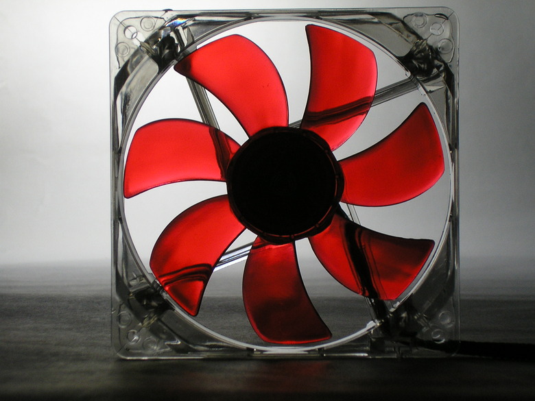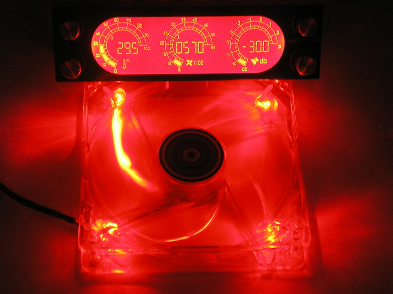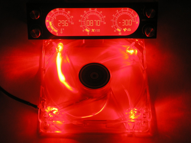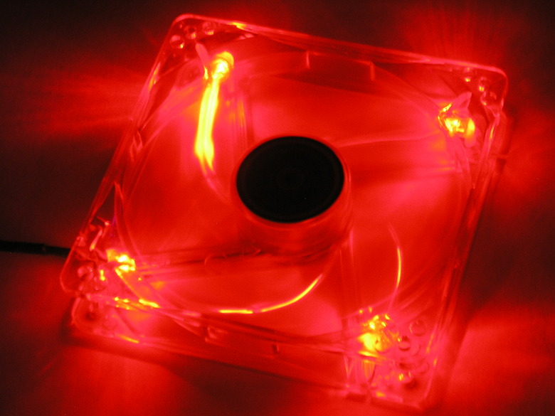 Корпус вентилятора выполнен из прозрачного пластика, лопасти из красного. Вентилятор оснащен красной подсветкой.