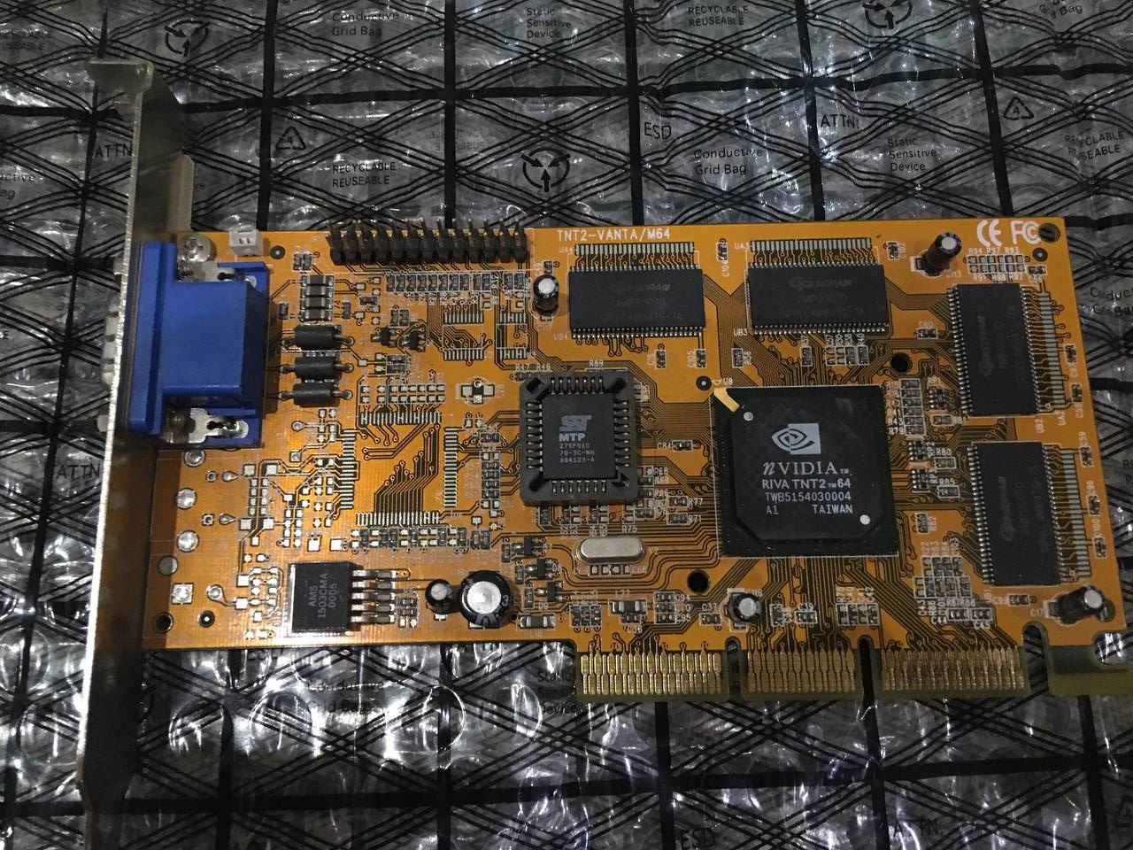 Карточки эти появились на свет в 1999 году и имеют в основе чип с урезанной до 64bit шиной памяти относительно полноценных TNT 2. Что конечно сказывалось на производительности не лучшим образом. Также на основе этого обрезанного чипа m64 выпускались карты nVidia Vanta в вариантах на 8 и 16Mb, у которых ко всему прочему были порезаны частоты чипа и памяти. Однако карточки эти довольно неплохо разгонялись и учитывая свою довольно низкую цену - были довольно популярны у экономных геймеров. Конкретно данный экземпляр запускается, но проверить его полноценно мешает отсутствие кулера, увы он имеет специфический посадочный размер в 50мм и ничего подходящего я пока подобрать так и не смог. Ну а "колхоз" я не приемлю.