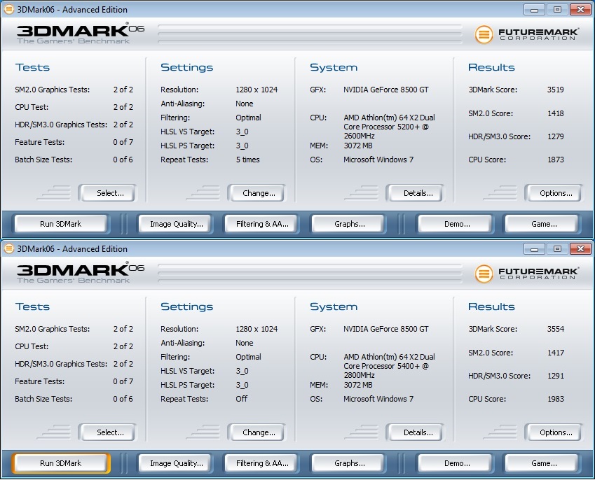 В 3DMark'06 также зарешала частота процессора, дав 6% прирост по производительности в процессорном тесте, на графические тесты же влияние есть, но незначительное.