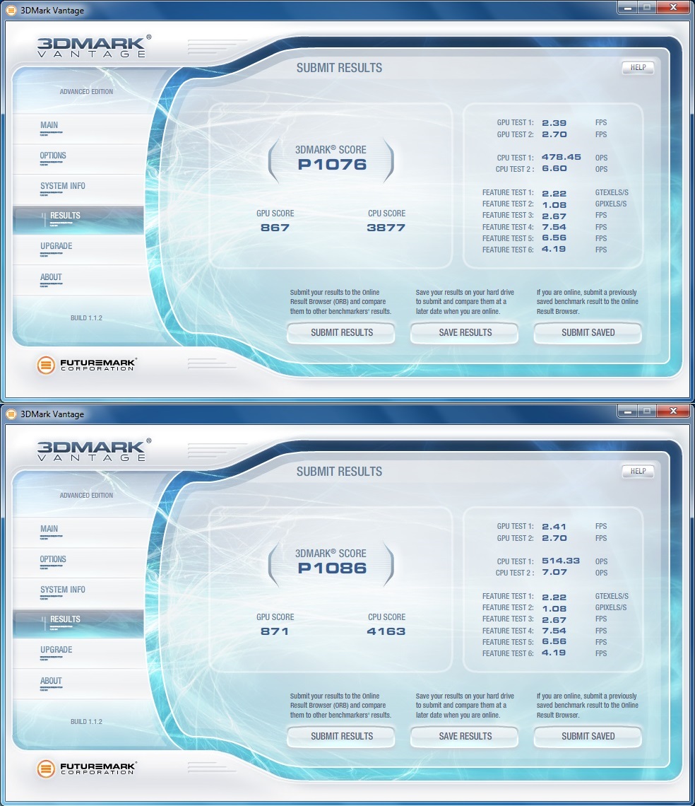 В 3DMark Vantage ситуация аналогичная, более высокая тактовая частота процессора даёт прирост в 7% по попугаям в процессорном тесте и практически никакого в графических тестах.